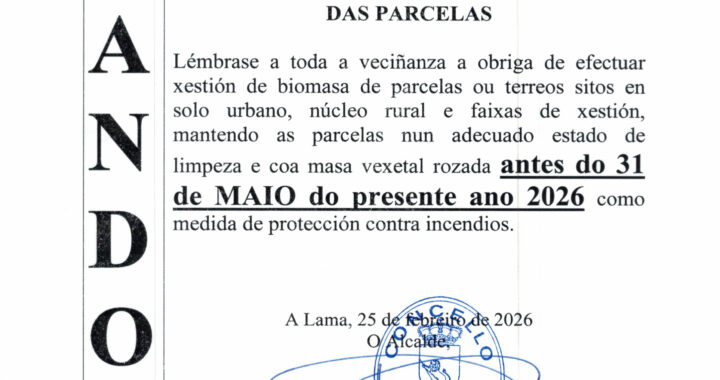 O Concello da Lama lembra á veciñanza a obriga de realizar a xestión da biomasa e limpeza das parcelas e terreos situados en solo urbano, núcleos rurais e nas faixas de xestión, de acordo coa Lei 3/2007 de prevención e defensa contra os incendios forestais de Galicia.